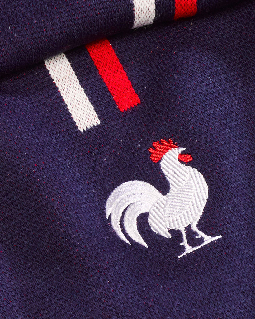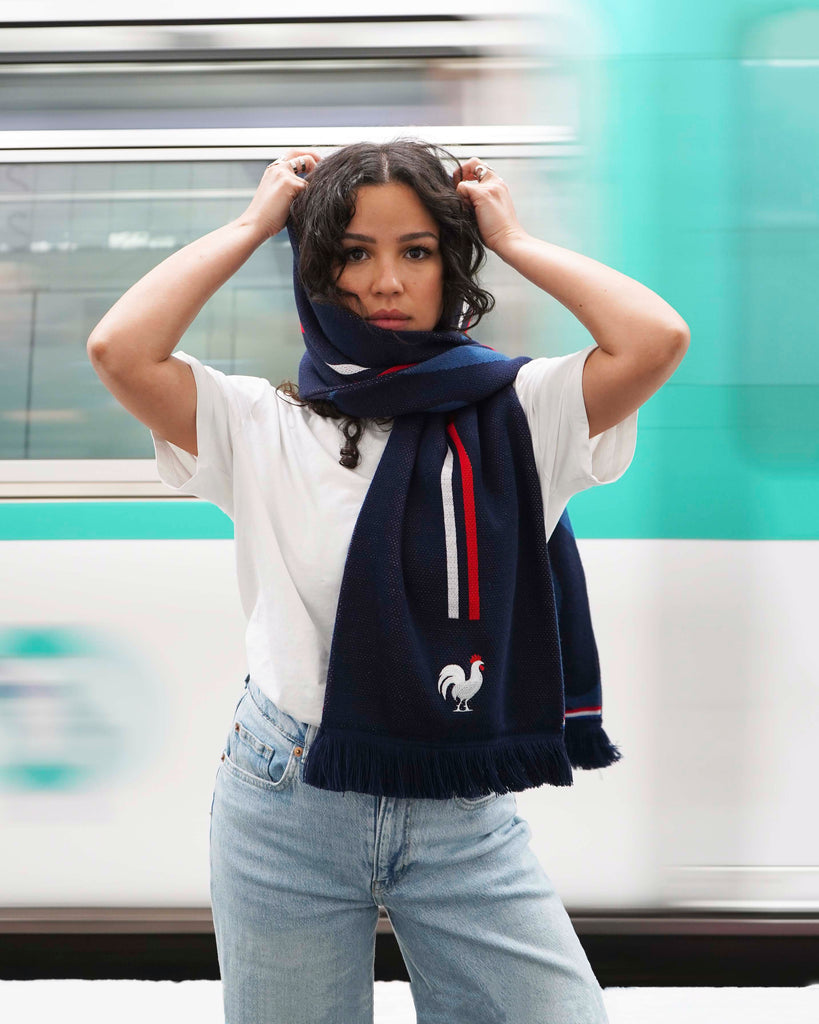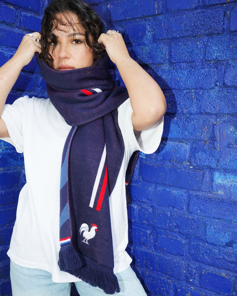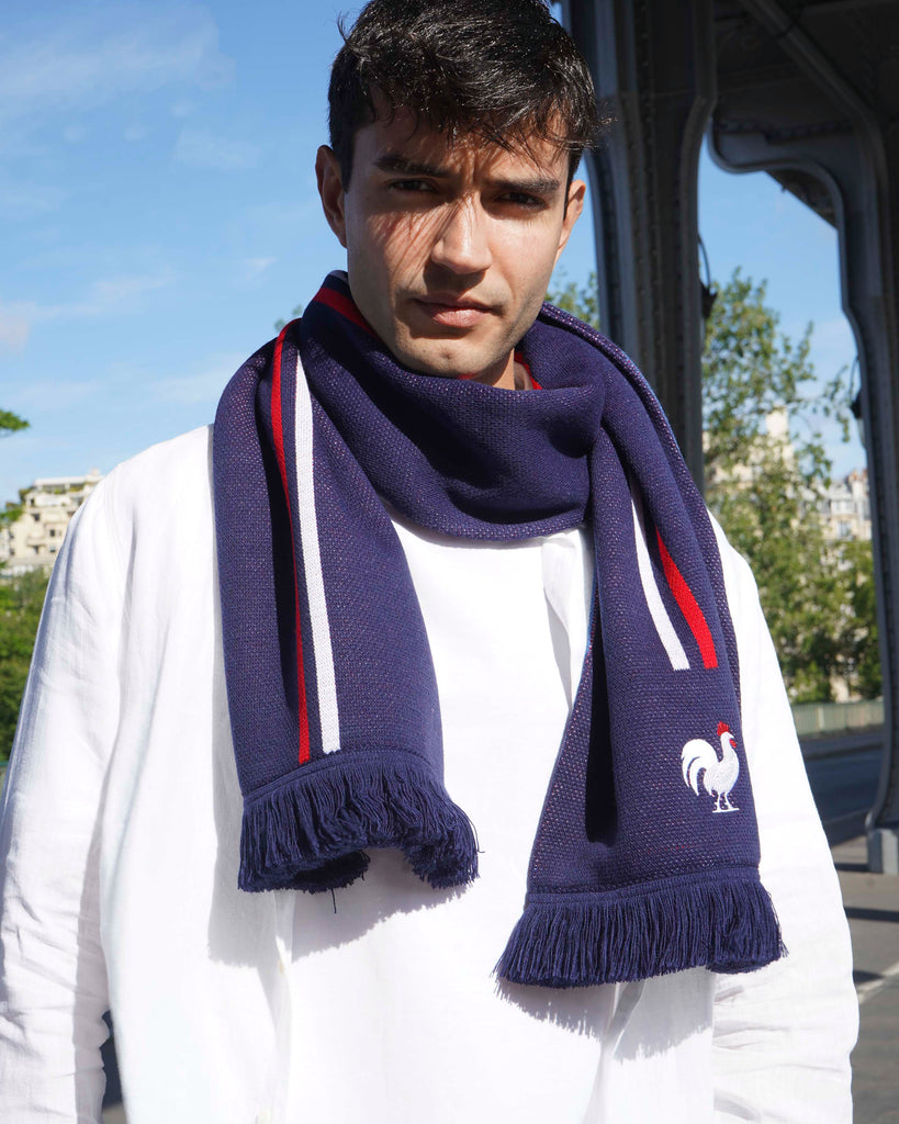 Mesurant 170 cm de long, cette écharpe arbore fièrement à l’avant l’emblème de la France : le coq. Réalisé en broderie délicate, il ajoute du relief et témoigne de la qualité exceptionnelle de cette pièce.
